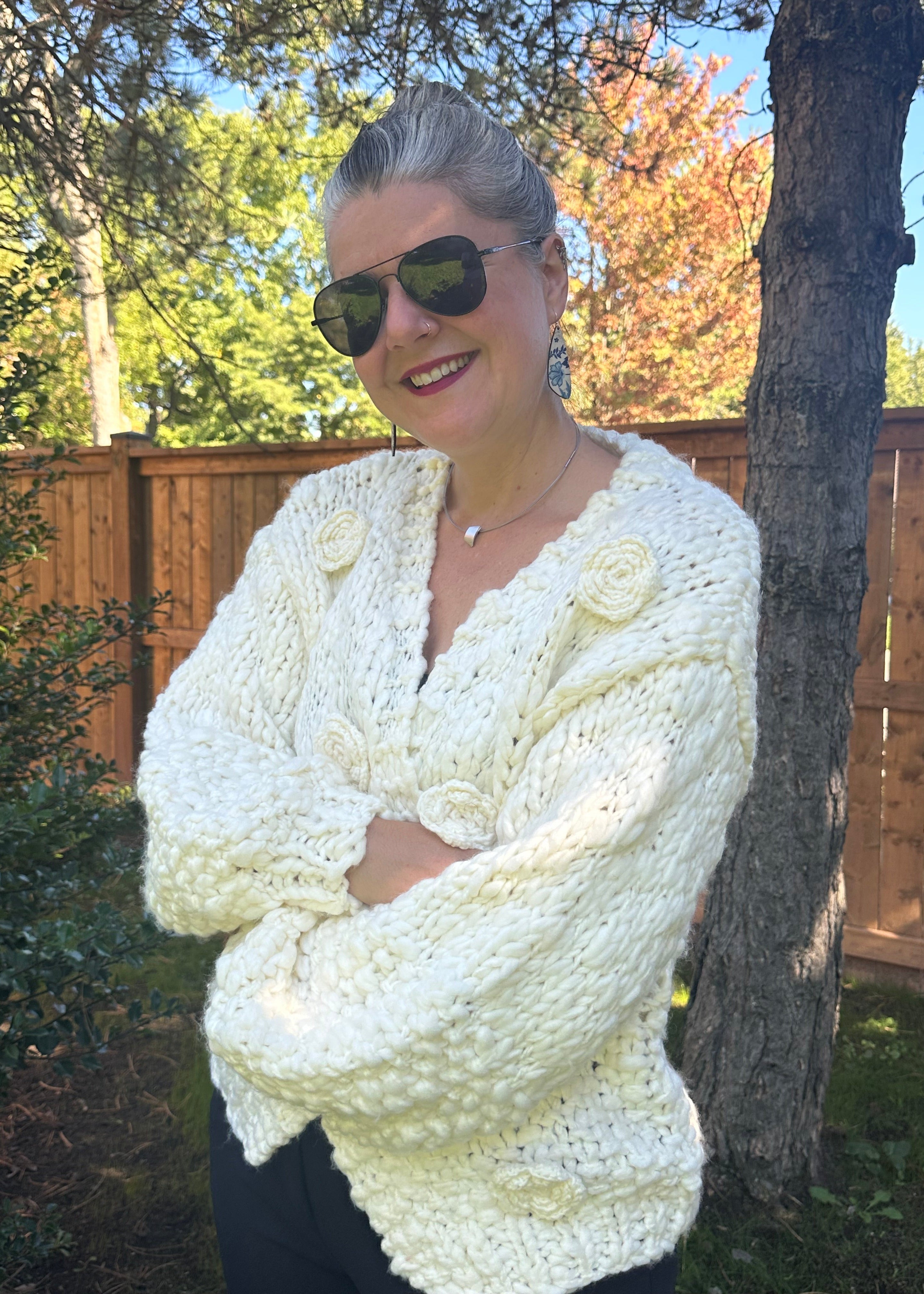 Cozy meets chic with this beauty. Handcrafted with a chunky knit texture and super soft ivory hue, this piece is the definition of effortless layering. The relaxed, open-front design makes it easy to throw on over any outfit, while the subtle and delicate rosette knit appliqued details add a sweet touch of charm.
