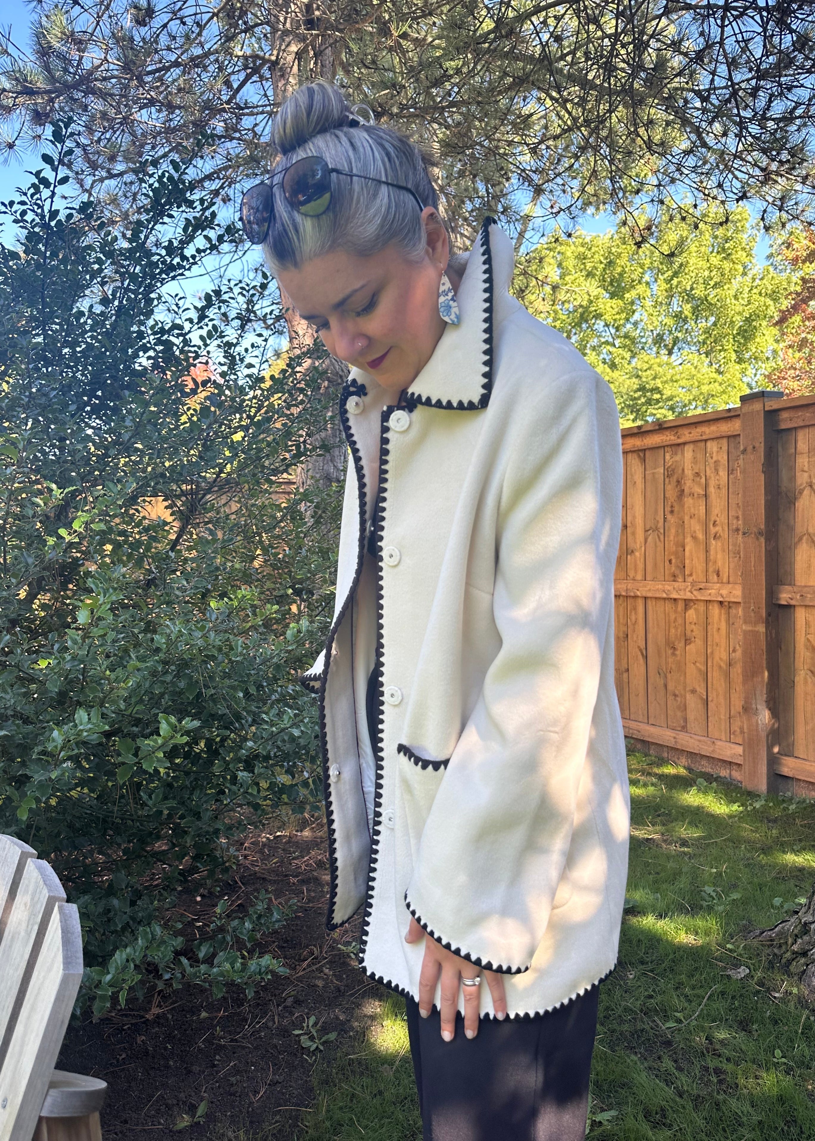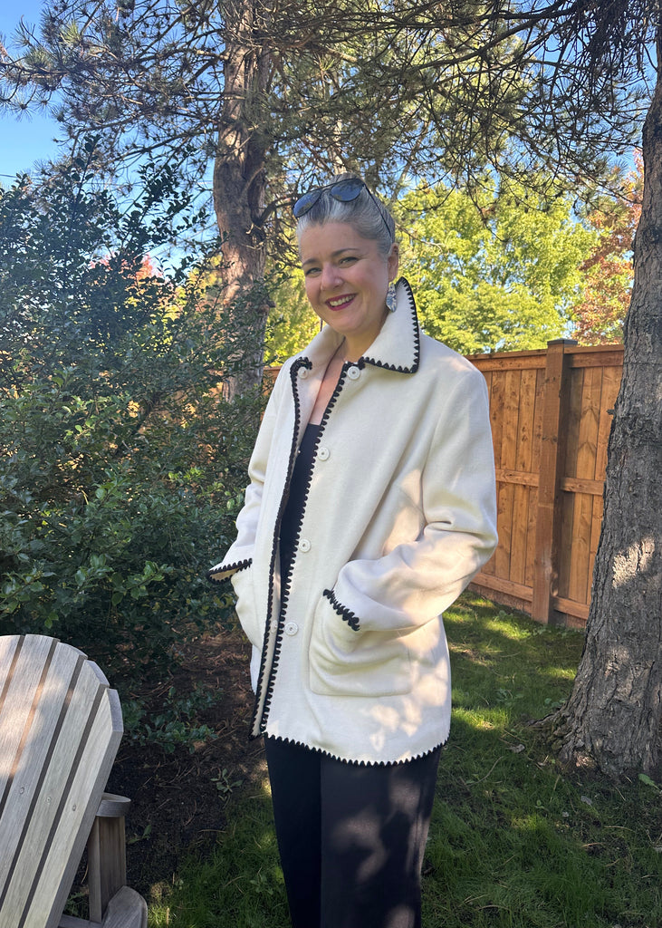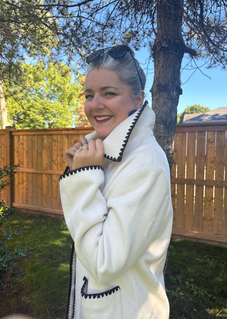 Sophisticated with a touch of playful detail, the Mae Coat is your effortlessly chic outer layer. Crafted in a soft ivory, it features bold black whipstitch trim that highlights the collar, pockets, cuffs, and hemline, giving classic tailoring a modern twist. The relaxed, midweight silhouette makes it perfect for layering, while deep front pockets keep it as practical as it is stylish. Magnetic front button closures.