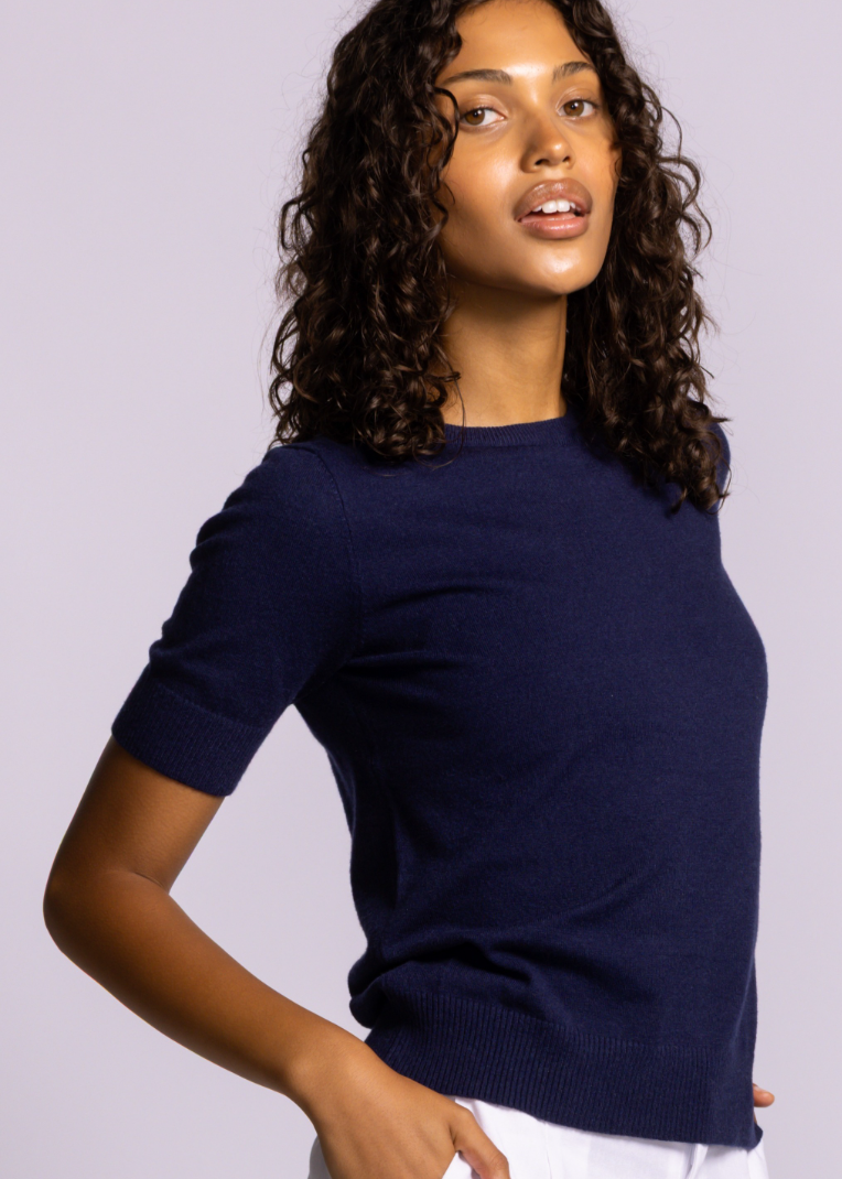 The Sandy Top is an elevated everyday knit designed for effortless styling. Featuring a classic round neckline, short sleeves, and ribbed hem and cuffs, this lightweight sweater offers a relaxed fit that feels both comfortable and polished.
